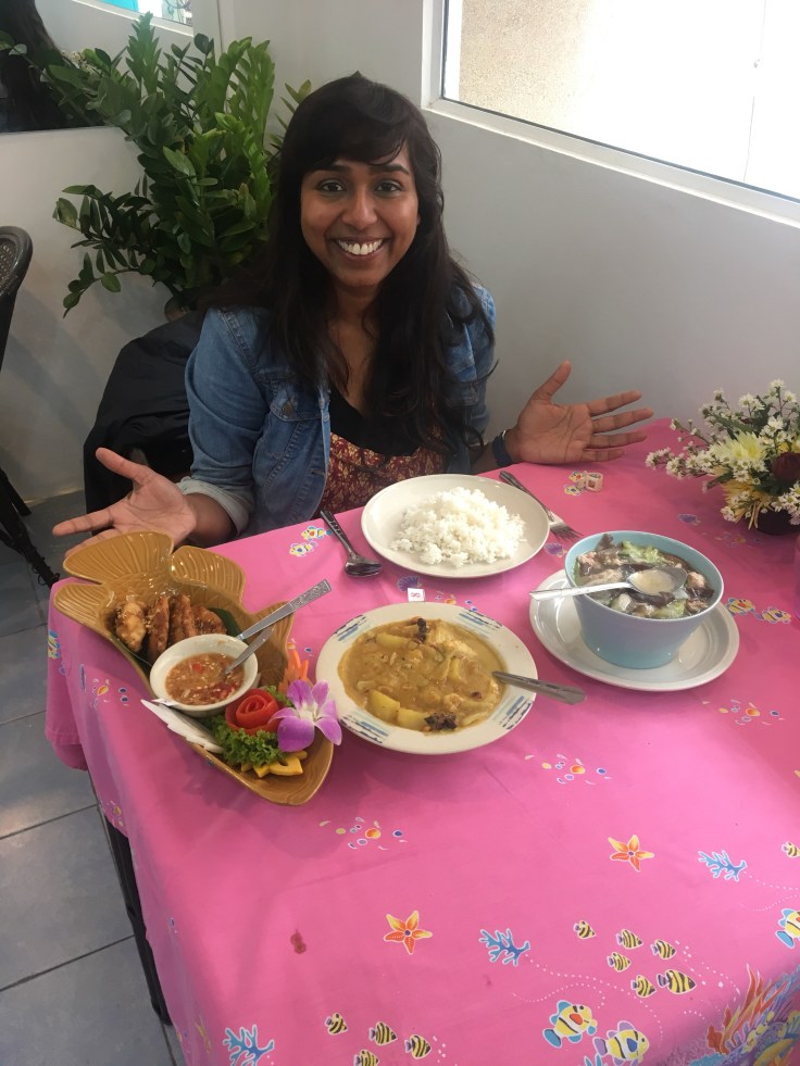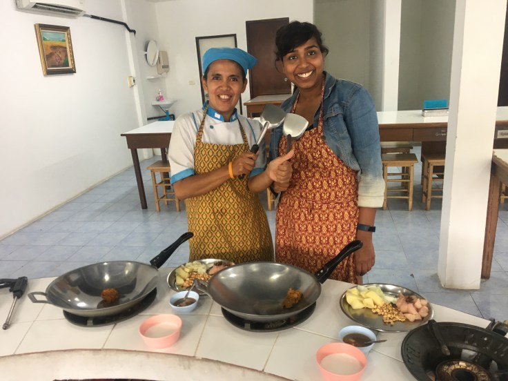 Did you know that there is a type of mushroom that offers no taste but is added to give texture to the soup, or you cut lemongrass differently for a soup since it is to add flavour but not eaten vs. For a curry where its actually consumed? I didn’t. These were just few tricks of the trade. One thing was obvious during the 3 hrs class, food was not just a thing you consume or a task, it was an integral part of the culture. Also, it was amazing to learn the reason and health benefits of different ingredients. Every little thing that went in a dish has a purpose. At the end of few hours of hard work, I got to enjoy the fruit of my labour in a delicious lunch.